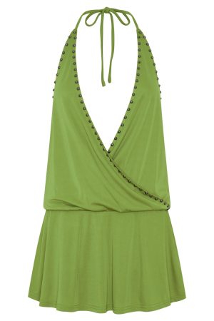 Ready to cause a commotion? The Favourite Moment Mini Dress Olive features a halter neck design with self tie strap. low plunge neckline. stud detailing. mini length and lined. Style with cowboy boots and silver accessories for an eye-catching look!