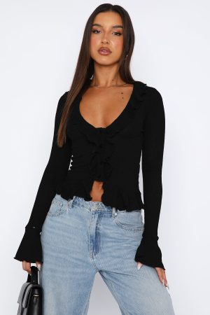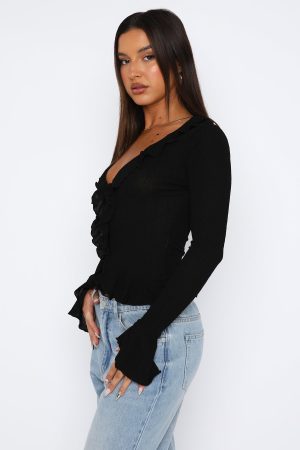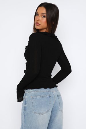 Make weekend styling simple with the Feel My Love Long Sleeve Top in Black. Featuring long sleeves. low neckline. front button closure and frill front detail. We love this paired with your favourite pair of White Fox Denim Jeans and gold accessories for a look we love!