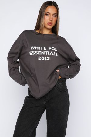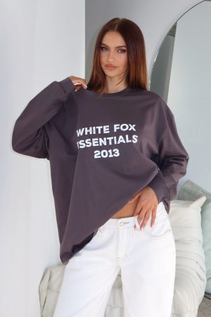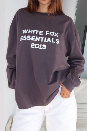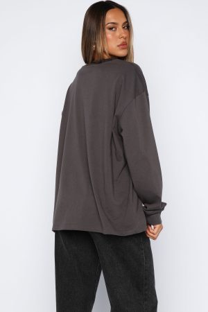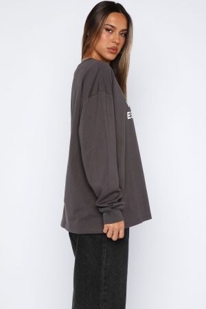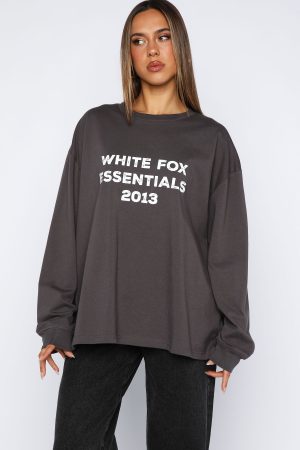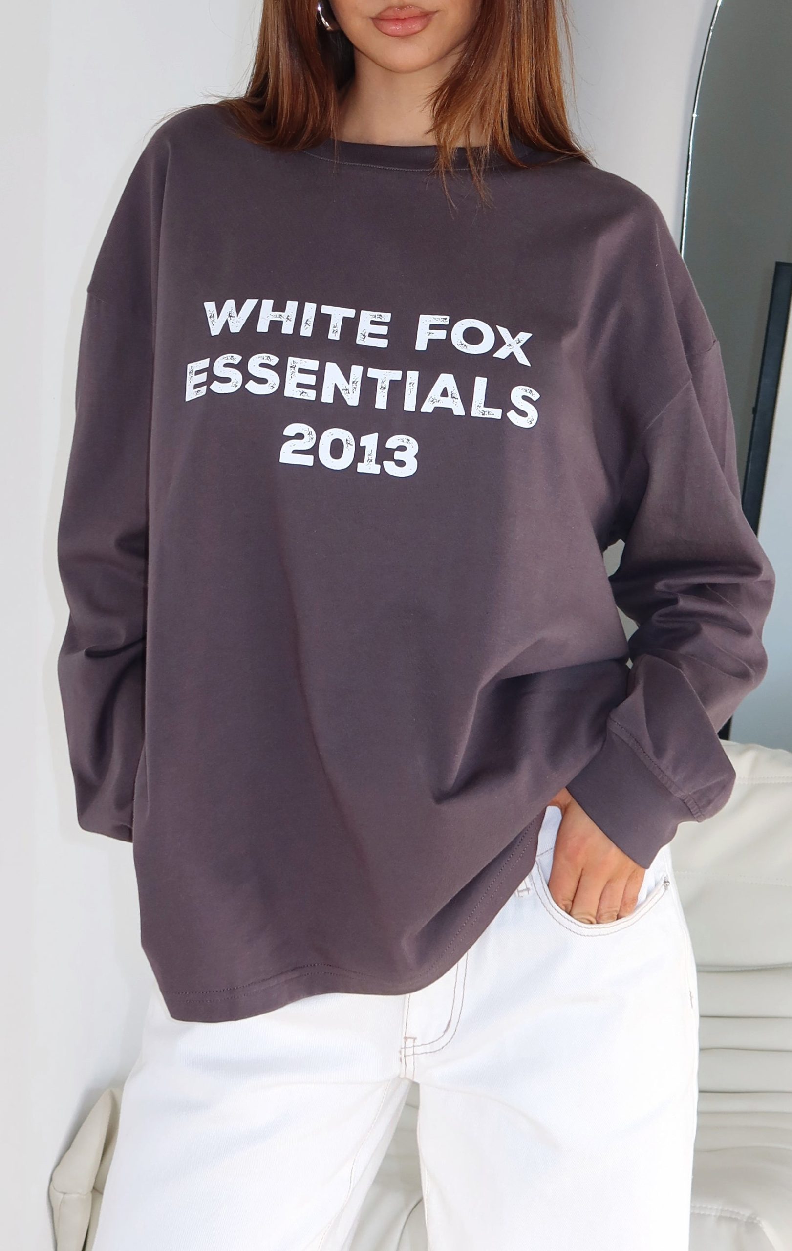 The vibe is cosy Sunday mornings! The Feel The Vibe Long Sleeve Tee in Charcoal features a crew neckline. slouched shoulders. long sleeve with ribbed cuffs. printed White Fox text at the front and relaxed oversized silhouette. Pair with your fav White Fox denim jeans and sneakers for a casual weekday fit!