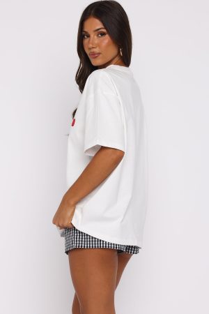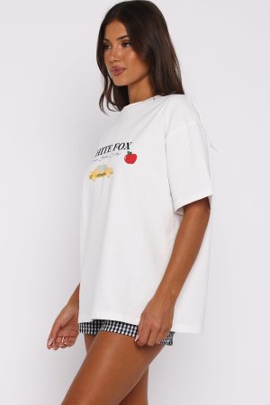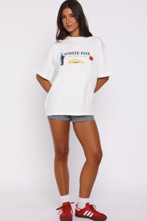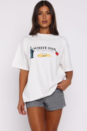 The Feeling My Energy Oversized Tee in White features classic crew neckline which frames slouched shoulders and easy-going short sleeves. while the oversized silhouette delivers relaxed city-cool energy. Fronted with iconic NY graphics paired with printed White Fox text. this tee is made for owning your scene. Style with shorts. your fav sneakers and layered gold jewellery!