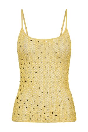 Leaving my phone on dnd and dancing the summer away in the Femme Fuel Sequin Crochet Top in Lemon. Featuring adjustable straps. a scoop neckline. sheer knit construction. and shimmering sequin accents. Style with Dunes And Dreams Shorts Lemon. and layered gold jewellery for late-night laughter under the stars.