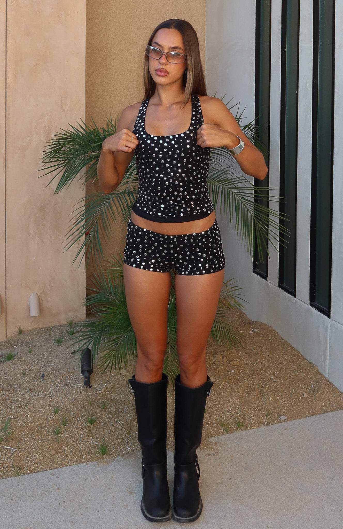 When the lights go down and the music rises. you’ll want to be wearing the Festival Feels Embellished Shorts in Black. These shorts offer a thin elastic waistband and a classic booty‑length cut. Made from a high‑stretch fabric and fully lined. they’re finished with eyelet and stud detailing. Style them with the matching Festival Feels Embellished Top for a coordinated. show‑stopping outfit.