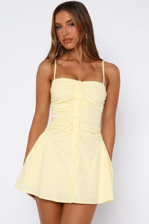 The Field Day Mini Dress Lemon is at the top of our vision boards! Features thin. adjustable shoulder straps. side ruched detailing. front button down closure. mini length. and faux panel detailing. Style with dainty gold accessories and kitten heels for the cutest vibe!