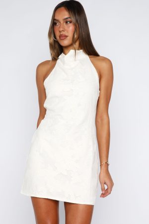 Lover girl energy! The Fight For Love Halter Mini Dress in Cream features a elegant halter neckline and A-line shape for a flattering silhouette. To add feminine interest the dress is designed with a subtle floral pattern and backless moment. Finished off fully lined and side zipper with secure hook‑and‑eye closure. Dress it down with sandals or for a night time look pair with kitten heels and layered jewellery!