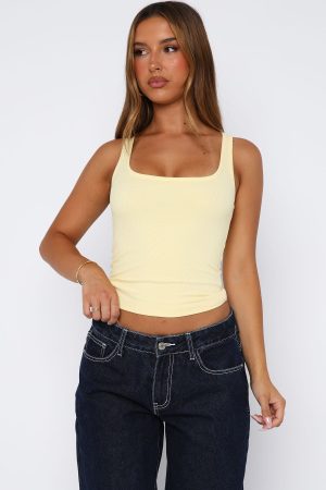 The perfect layering piece for every season! The Filled With Life Ribbed Tank Lemon features thick shoulder straps. a square neckline. cropped length and stretch material for an easy slip on design. Style with your favourite WF jeans for a look we adore!
