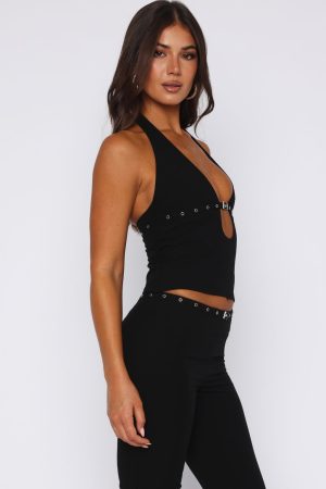 Turn heads in the The Firestorm Halter Top in Black. Features a halter style neckline with closure. plunge neckline with front cut out design. front buckle design with silver hardware. cropped fit. hidden side zipper with hook & eye. mesh lined and hugging fit. Complete the look with the matching Firestorm Pants in Black for a look we love!