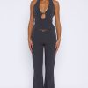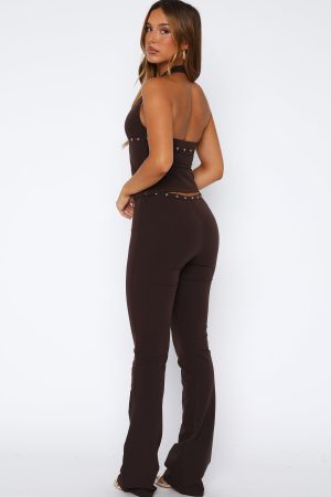 Complete the set with Firestorm Pants Chocolate. Features a hidden side zipper. buckle design at waistband with gold plated hardware. full length and slight flare. Pair with the matching Firestorm Halter Top for a look we adore!