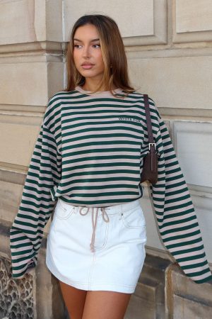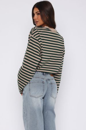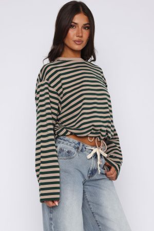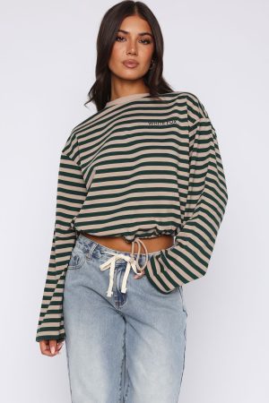 Introducing your newest winter essential – First Time Here Long Sleeve Tee in Green/Tan Stripe! Features a round neckline. wide long sleeves. stitched White Fox text side front and drawstring hemline for a subtle cropped fit. Effortlessly pair with your fav White Fox denim jeans and sneaker for the perfect weekend coffee date fit!