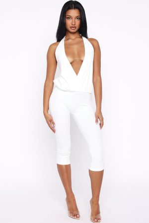 Falling head over heels for our Flawlessly Lost Jumpsuit in Cream! This sultry piece features fixed halter straps. an ultra-plunge neckline. and a fitted silhouette. Below-the-knee pant length adds a chic touch. while the backless design with a thick self-tie bow creates a dramatic effect. Crafted from high-stretch fabrication and lined at the bust for comfort. Style with wedges and layered gold jewellery for the perfect summer fit!