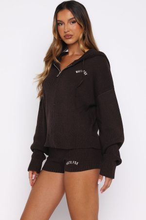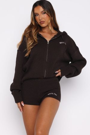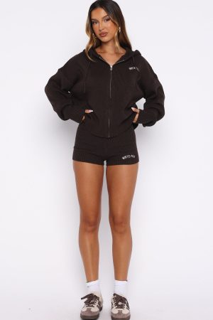 Looking cute and cosy has never been easier in the Floating By Knit Zip Front Hoodie in Chocolate! Features a hood with drawstring ties. slouched shoulders. long sleeve with ribbed cuffs. zipper closure down centre front. stitched White Fox text side front. ribbed hemline for a structured waist and ribbed knit fabric. Pair with the matching Floating By Knit Shorts for a look we love!