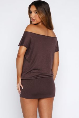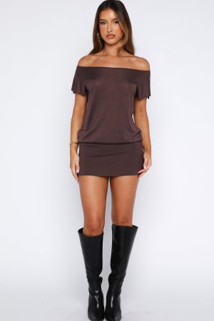 For balmy days and cold nights. look to our Following My Instincts Mini Dress in Chocolate! Featuring an one-shoulder neckline. a thin elasticated waistband for a cinched waist. fitted skirt with stretch. and a subtle shimmer woven throughout the fabric. Pair with kitten heels or boots for warmth and layered gold jewellery!