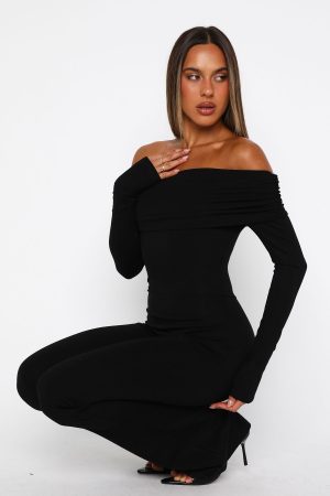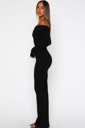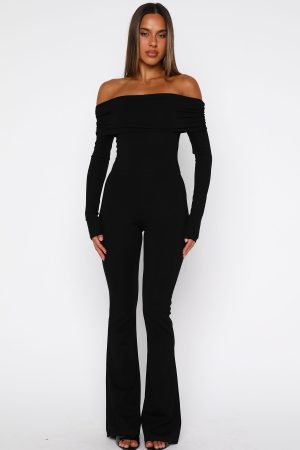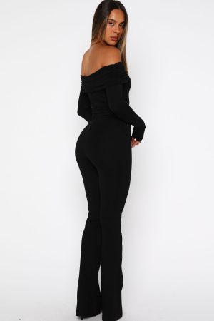 Sai la vie! The For the Girls Long Sleeve Jumpsuit in Black is designed with an off-the-shoulder neckline supported by discreet grip-tape. a fold-over bust. and long fitted sleeves that gently skim your fingers. The bodice hugs your curves while the pant flares out. creating a beautifully balanced silhouette in a high-stretch fabric. Style it with statement heels and layered gold jewellery. and you’re ready to dance the night away.