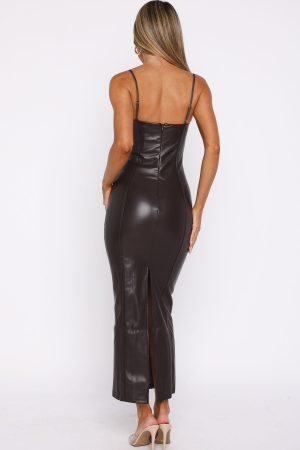 The Forever Wanting Midi Dress in Chocolate is the ultimate evening staple you’ve been searching for. Designed with thin adjustable straps. a square neckline. and a figure-hugging silhouette. it’s made from sleek PU fabric and fully lined for a luxe finish. Details include a hidden centre back zipper with hook-and-eye closure and a high-cut back split for added drama. Style with kitten heels. layered gold jewellery and a gloss lip.