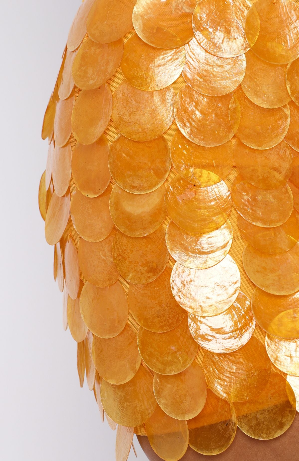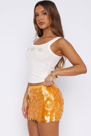 Make an unforgettable entrance in Forgiven Aura Shell Mini Skirt in Mango! Features shell detailing. lined and stretch fabrication for an easy slip on and off. Complete the look with a white tank top and high shine accessories!