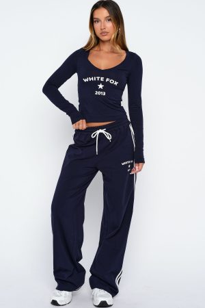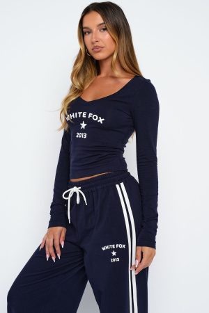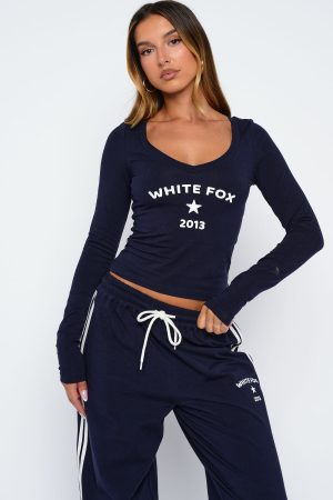 This colour combo makes casual look instantly cool! The Found You Out Long Sleeve Top Navy features a scooped neckline. long sleeves. stretch material for an easy slip on design and White Fox text centre front. Have a five star quality fit by pairing with the matching Found You Out Track Pants Navy.