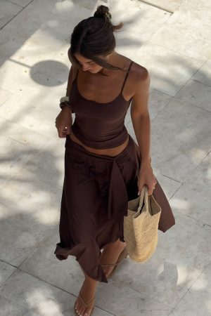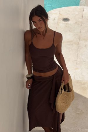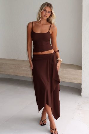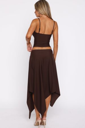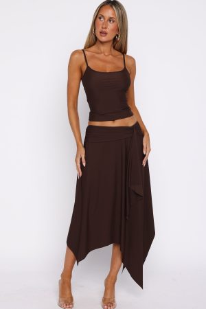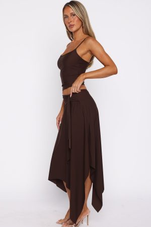Meet the Free All Night Midi Skirt in Chocolate. your effortless summer staple. Designed for breezy wear. it features a slim elastic waistband with a sash tie. soft stretch fabric. elegantly offset by an asymmetrical hemline that brings modern movement. Pair with the Lifetime Top for sun-soaked days and balmy evenings alike.