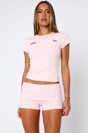 The From The Archives Gigi Baby Tee Pink was designed for comfort in mind! Featuring short sleeves. a high scooped neckline. print logo side fronts. fitted and soft stretch fabric. Style with the From The Archives Gigi Fold Over Booty Shorts or From The Archives Gigi Fold Over Flare Pants!