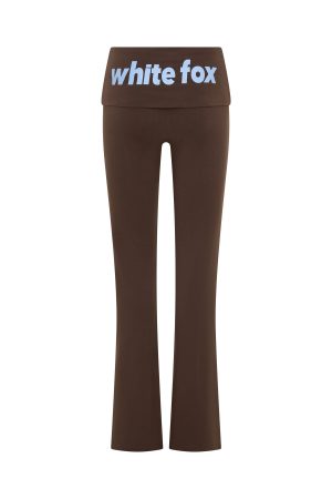 Lounge in style with the From The Archives Gigi Fold Over Flare Pants Chocolate. Featuring a thick. elasticated fold over waistband with back logo detailing. full length. unlined material. and flare design. Team with your favourite From The Archives top in Chocolate!