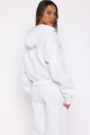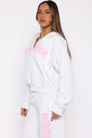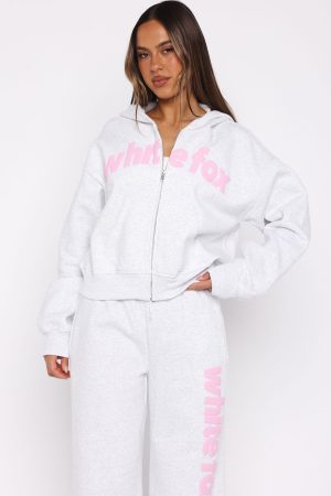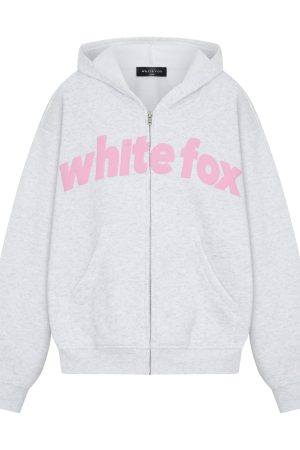 Sundays just got a whole lot cooler and cosier! The From The Archives Kenzie Boxy Zip Front Hoodie Grey Marle is designed with a relaxed hood. slouched shoulders and ribbed hems which round out an boxy silhouette. Featuring long sleeves. front zipper closure. a roomy front pocket. and an unlined fleece interior. this hoodie delivers a cozy feel. White Fox distressed text embellishes the front. Style with the matching From The Archives Kenzie Wide Leg Sweatpants Grey Marle.