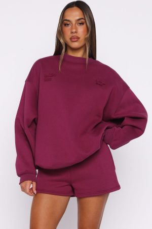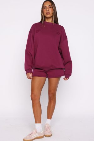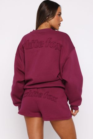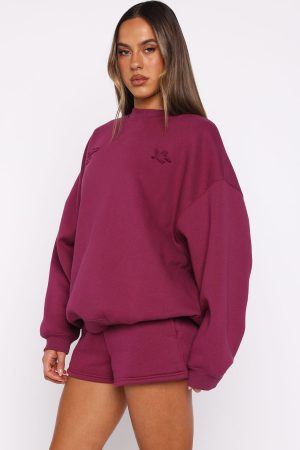 Add a pop of colour to your lounge look with the From The Archives Lexi Oversized Sweater in Berry. It features a classic crew neckline with ribbed trim. drop shoulders. and long sleeves with ribbed cuffs for a oversized fit. The ribbed waistband and distressed White Fox text at side font and centre back add playful detail. Match it with the From The Archives Lexi Lounge Shorts for the cosiest coordinated set yet.