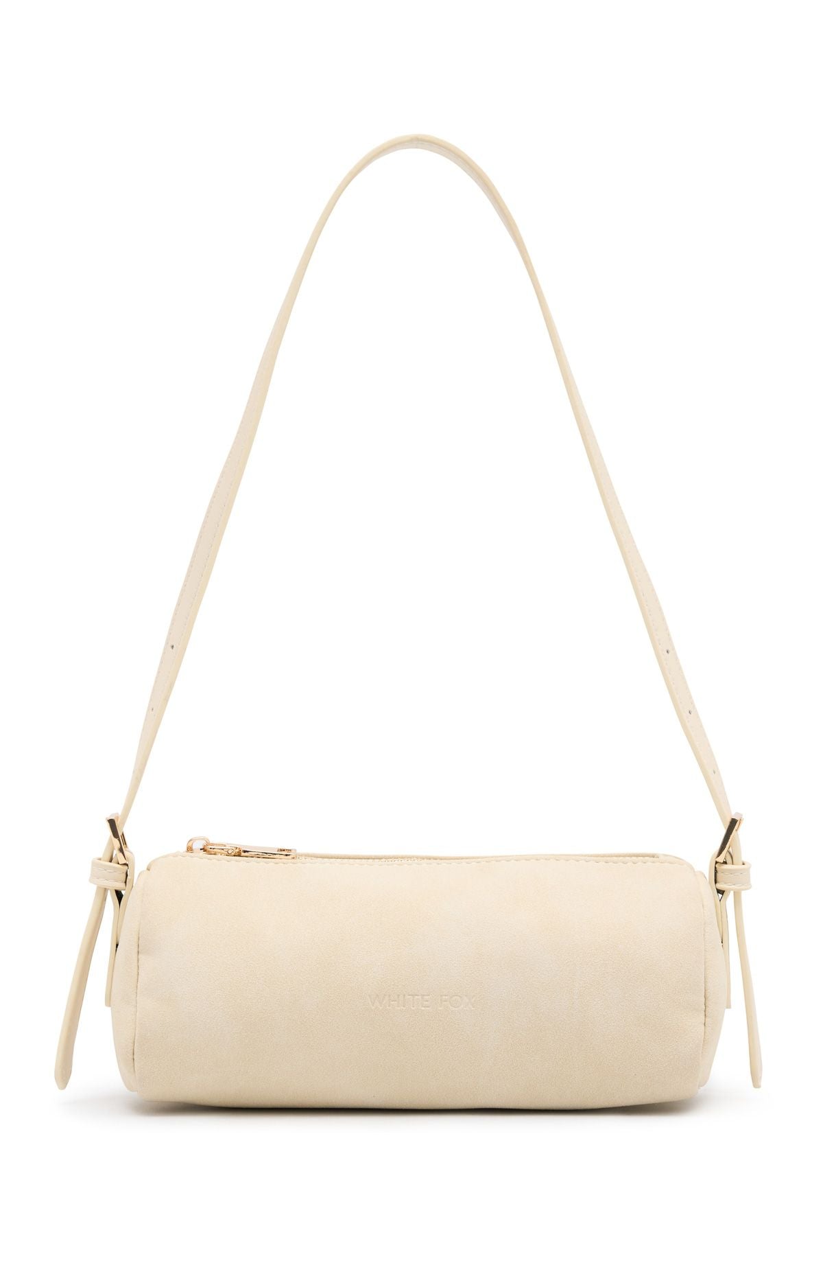 No fit is finished without the Gannon Shoulder Bag in Bone Faux Suede. Features a sleek elongated silhouette with thin shoulder straps. secure zipper closure and adjustable buckle detailing. Embossed White Fox text at the centre front adds subtle branding. Crafted from bone-toned faux suede. it brings texture and polish to any look. Pair with a mini dress. belt and boots for a cool. complete fit.