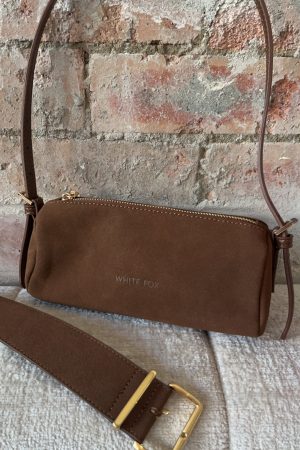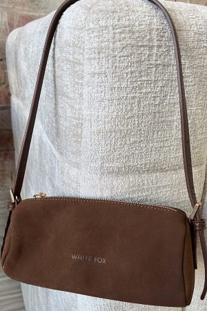 No fit is finished without the Gannon Shoulder Bag in Chocolate Faux Suede. Features a sleek elongated silhouette with thin shoulder straps. secure zipper closure and adjustable buckle detailing. Embossed White Fox text at the centre front adds subtle branding. Crafted from bone-toned faux suede. it brings texture and polish to any look. Pair with a mini dress. belt and boots for a cool. complete fit.