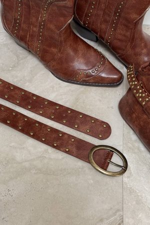 Styled for the wild. the Gelina Belt in Vintage Gold/Tan pairs a striking buckle with stud detailing and an adjustable length for effortless edge and festival‑ready flair.