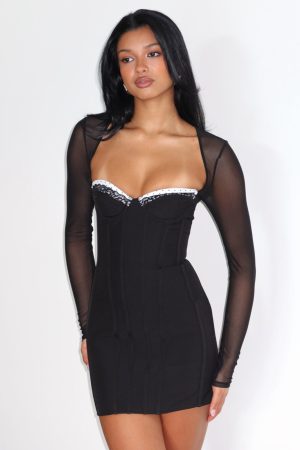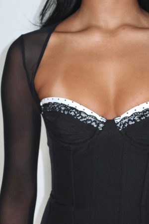 Date‑night perfection! the Get Into It Long Sleeve Mini in black features a sweetheart neckline with underwire bust cups trimmed in playful polka‑dots. sheer long sleeves. and structured boning down the bodice flowing into faux‑boning panels at the front. The fitted silhouette is fully lined. with an adjustable tie at the back and an invisible zipper plus hook‑and‑eye for a seamless finish. Complete the look with kitten heels and layered gold jewellery for the perfect sweet but sexy look.