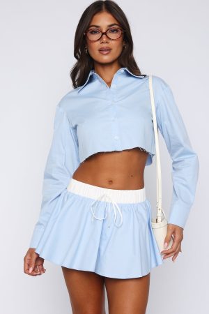 The Getting Out Of Hand Cropped Shirt in Blue blends structured details with a subtle feminine silhouette. Features a collar neckline. slouched shoulders. long sleeve with button closure on cuff and button closure down centre front. Feel complete by pairing with the Getting Out Of Hand Skort in Blue for a look we are obsessed with!