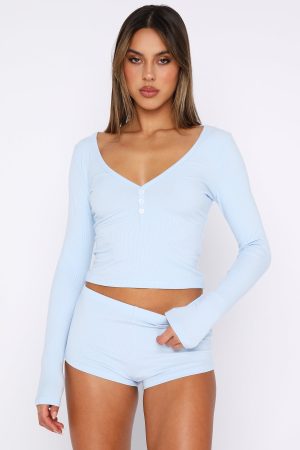 You are sure to be slumber party ready with the Girl Talk Pyjama Set in Baby Blue. This matching pyjama set features a long sleeve top with button closure. shorts with an elasticated waistband and ribbed. stretch fabric. Team with your fave slippers for a cosy look we love.