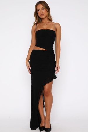 Be the main character in the Girl World Maxi Dress Black. Features thin adjustable straps. square neckline. lined. slightly sheer. front and back cut out design. ultra high side split with frill detailing and maxi length. Slip on a pair of kitten heels and clutch for a formal look we love!