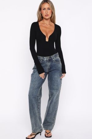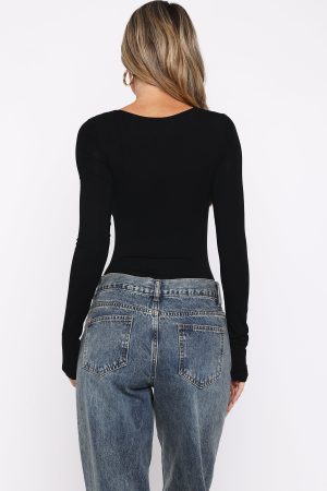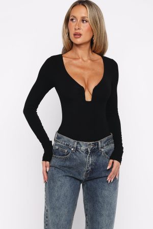Make everyday chic! The Girls Night Out Long Sleeve Bodysuit Black features a dramatic plunge neckline with subtle boning and sculpted bust detailing. long sleeves. and a form-fitting silhouette made from high-stretch fabric for a sleek. second-skin finish. Style it with your go-to denim jeans. kitten heels. and layered gold jewellery for an effortless yet striking look.