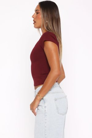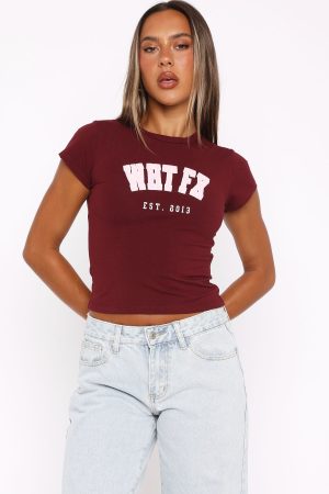 Ace your exams AND campus fashion with the Give It Away Baby Tee Burgundy! Features short sleeves. textured WF logo centre front. fitted and soft stretch fabric. Just add your favourite pair of denim jeans!