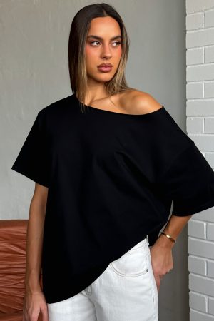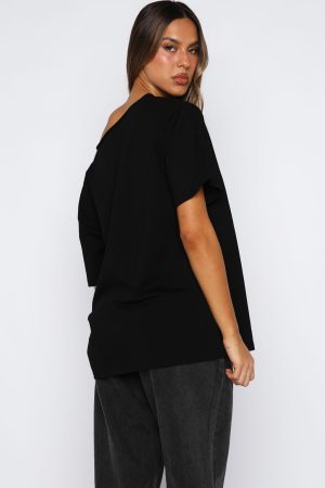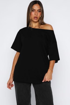 Your newest capsule wardrobe piece has entered the chat! Introducing the Give Me Options Off Shoulder Tee in Black! Designed with a one-shoulder neckline with raw cut detailing. slouched shoulders. short sleeves and oversized silhouette. She is perfect but make it even better styled with your fav denim jeans and sunnies.