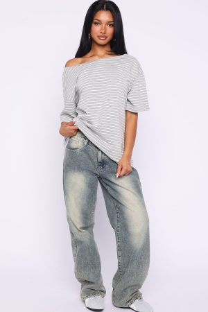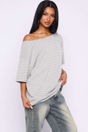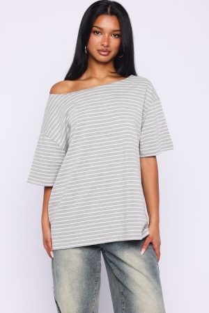 Give Me Options Off Shoulder Tee Grey/White Stripe
