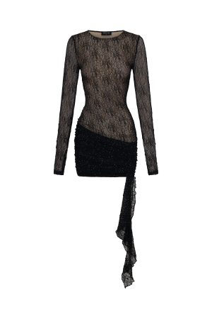 Sparkle and glitter season! The Glitter Up Long Sleeve Mini Dress Black features a jewel neckline. sheer long sleeves. a fitted silhouette in lace with delicate diamante accents. ruched detailing at the hips and side front. an attached sash for extra style. and a comfy mesh lining for polish. Pair with your tallest heels and layered gold jewellery for a standout xmas day fit.