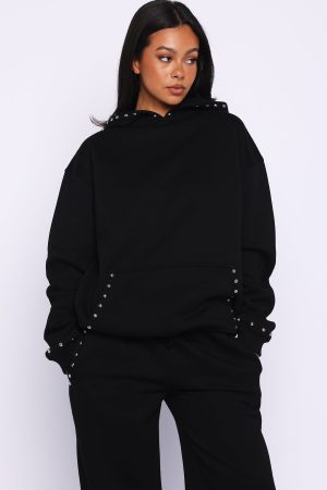 Add edge to your loungewear with the Glow Your Own Way Studded Oversized Hoodie in Black. Featuring a relaxed hood. long sleeves with ribbed cuffs and stud detailing on the sleeves. hood and front pocket. plus a soft unlined fleece interior and oversized silhouette. Pair with the matching Glow Your Own Way Studded Wide Leg Sweatpants in Black for a bold. laid-back look.