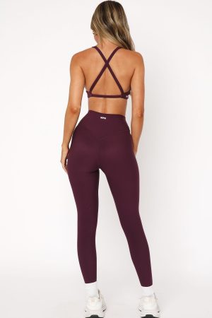 Elevate your gym-drobe with the Go Getter High Waisted Leggings in Plum. These training tights are high waisted with a supportive wide waistband. flattering curve defining ‘V’ shape booty seam and anti-chafing gusset seam for added confidence. ankle grazer length with logo centre back of waistband. Pair with one of our matching sports crops or bras in Plum for a look we are loving!