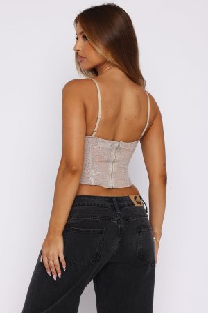 All eyes on YOU! The Goddess Within Bustier Champagne features thin adjustable straps. mesh lined. slightly sheer. boning in bodice. bust underwire. back zipper and clasp closer. cropped length and stunning glitter detailing. Show off your glow’ and pair with low rise jeans and kitten heels.