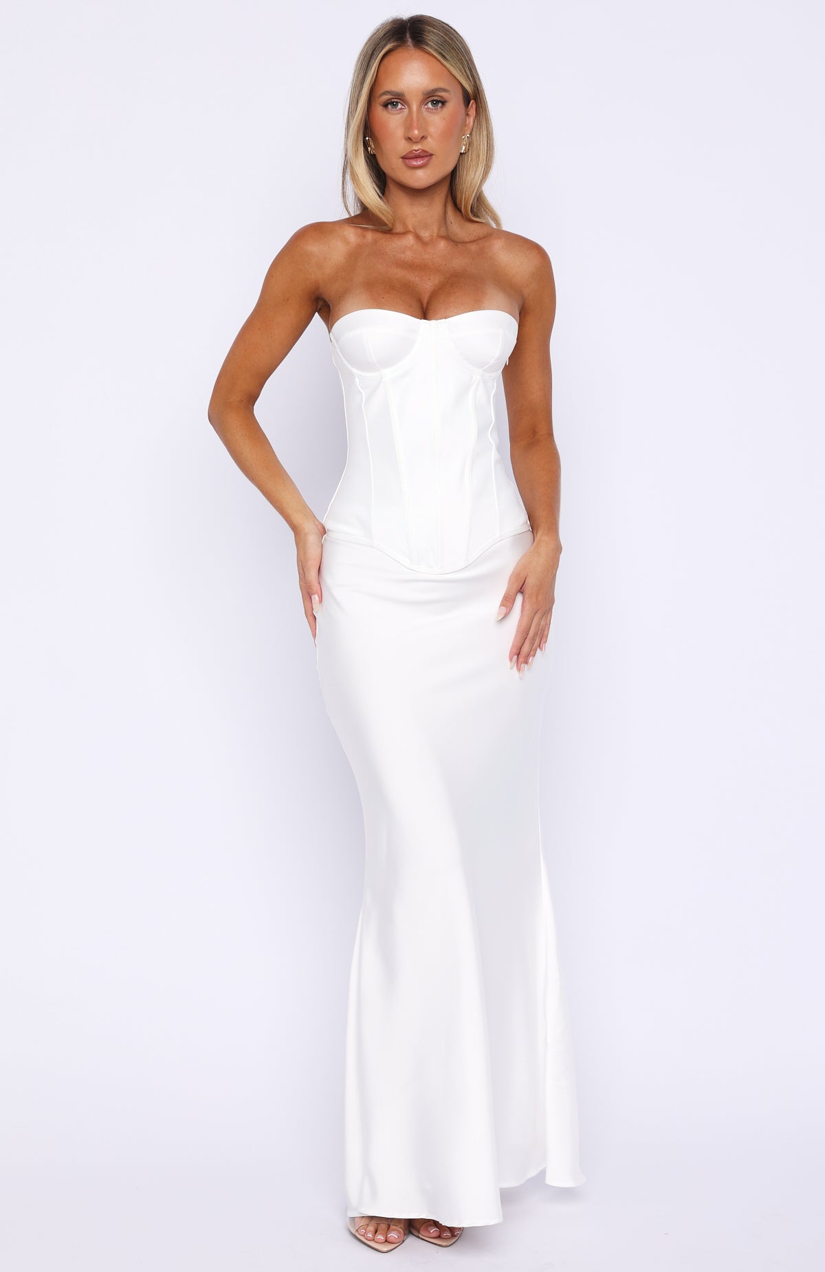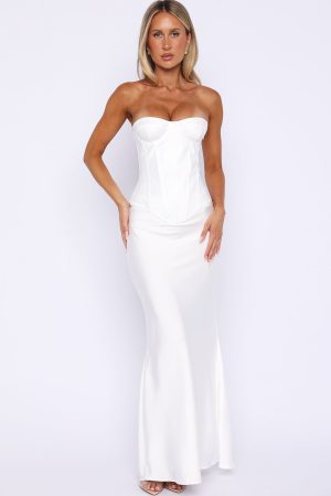 Now and Forever. The Golden Mile Strapless Bustier Off White features a strapless neckline with built-in grip tape for secure support. underwired bust cups and internal boning for shaping. and a corset-inspired lace-up back paired with a side zipper and hook-and-eye closure for a seamless fit. It’s fully lined for comfort. Style it with the Forever Starts Now Maxi Skirt in Off White for a timeless bridal moment.