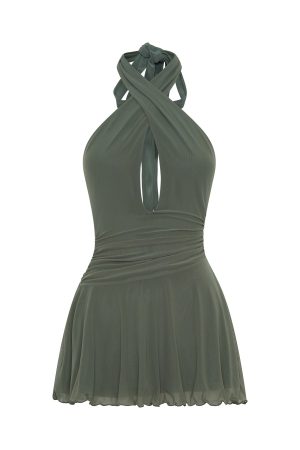 Warm summer nights and the Golden Nights Mini Dress Olive are the perfect pair! Features an adjustable tie halter neck. low neckline. back adjustable tie detailing. lined. mini length and ruching detail on sides. Show off your style and pair with a statement handbag and thong heels.