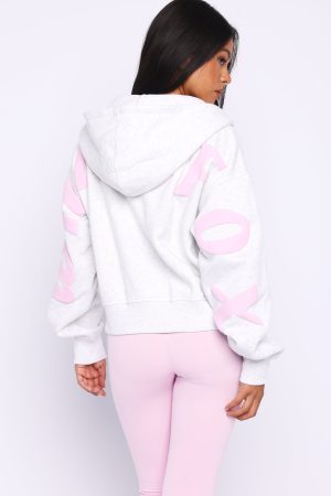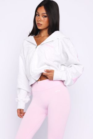 Busy bodies need the Gone Away Boxy Zip Front Hoodie Grey Marle. Designed with a double lined. ribbed cuffs. and ribbed hem band. This boxy fit hoodie features long sleeves. front zipper closure. and an unlined fleece interior. this hoodie delivers a cozy feel. Finished with puff print White Fox text side front and across the back flowing down the sleeves. Style with the matching active set for a cute fit.