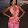 Stand out in the Good Decisions Mini Dress Feline! Features a halter style neckline. mesh lined. slightly sheer. front cut out detailing. mini length. ultra low-cut neckline. back self tie detailing and gorgeous printed fabric. Pair with knee high boots and gold accessories!