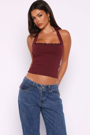 Tags: buystructure:fashion, clothing, colour:red, discountable, discountable_uk, discountable_us, Division:Fashion, end-use:evening, fabric-type:80-polyester-20-spandex, feed-cl0-newarrivals, feed-cl2-fullpriceau, feed-cl2-fullpriceuk, feed-cl2-fullpriceus, feed-cl4-winter, Going Out Tops, halter, halter top, halterneck, lace, length:sleeveless, New Arrivals, new_arrivals_au, new_arrivals_uk, new_arrivals_us, pattern:plain, recently_added_2026-02-04, SALE40, season:transeasonal, size:l, size:m, size:s, size:xl, size:xs, size:xxs, sizeguide:clothes, subcat:fashion-tops, subcategory:Going Out Tops, tone:Burgundy, tops
