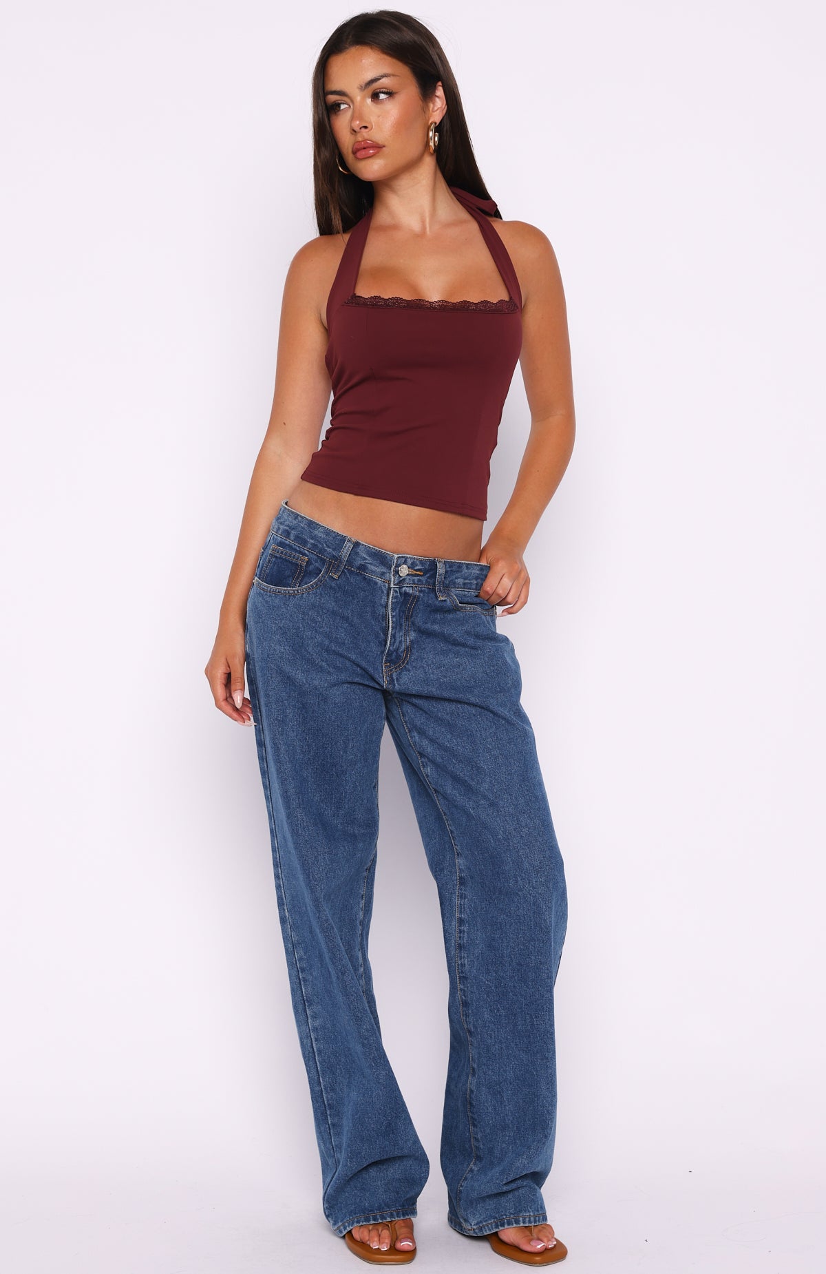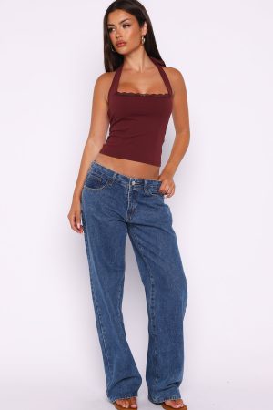 Golden girl vibes in the Good Feels Halter Top in Burgundy. featuring thick self‑tie halter straps. a chic square neckline with delicate lace trim and a fitted silhouette in high‑stretch. unlined fabrication for a sleek fit. Style it with denim or a skirt and your favourite accessories for a sun‑soaked. feminine look.