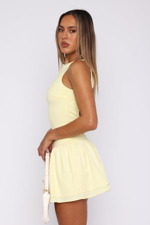 Step into summer with the Good Girl Mini Dress Lemon. Features a high neckline with back hook and button closure. mini length. mesh lined. backless cut out design. back zipper and clasp closure on skirt and drop-waist fit bodice. Style with sunglasses and kitten heels to show off your glow!