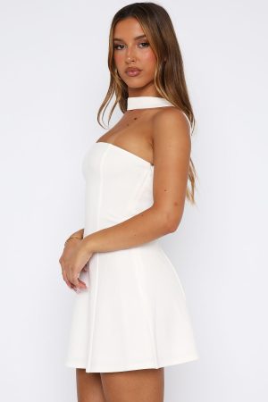 A statement piece we can’t get enough of! The Good Graces Halter Mini Dress White features a strapless design with gel grip at bust. adjustable neck tie detailing. lined. mini length. and invisible side zipper and clasp closure.