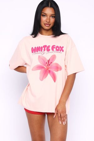 Add a pop of playful charm to your wardrobe with the Got That Glow Oversized Tee in Peach. This tee pairs an oversized fit and slouched shoulders with a classic round neckline. while bold White Fox text and graphic front add instant personality. Effortlessly style it with lounge shorts and your fave sneakers for a look that’s comfy. chic. and full of glow-up energy.