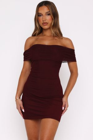 Get romantic in the Got The Talent Off Shoulder Mini Dress Burgundy. Features an off the shoulder design. ruched fabric detail. hugging silhouette. mesh fabric and stretch fabric for an easy slip on design. Pair with a kitten heel. gold accesories and a mini bag for a look we love!