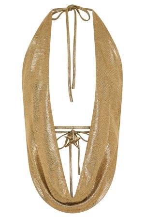 Our new in: sultry and summery. The Got You Covered Cowl Neck Top in Gold features self tie halter neck straps. cowl neckline. gold hardware centre front. drawstring back self tie straps. backless and lined. Complete the look with a maxi skirt. kitten heels and gold accessories for a look we are loving in the warmer seasons!